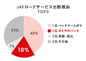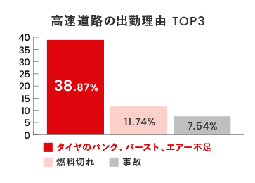 それを怠る人は多い!?●JAFの出動理由の2位、3位がタイヤのトラブルで、全体の4分の1。さらに一般道路におけるタイヤのパンクが全体の約18%に対し、高速道路では約38%と2倍以上になります(出典:JAFホームページ)。いかにタイヤのメンテナンスが重要かがわかりますね。
